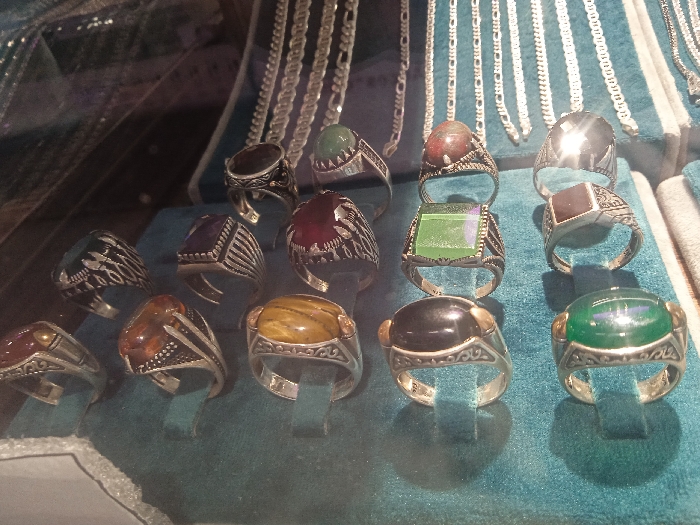 - "The image presents a detailed close-up of fifteen ornate silver rings, each featuring a prominent gemstone or decorative stone, displayed within a retail setting" by FM-zlWXg1, licensed under CC BY 4.0