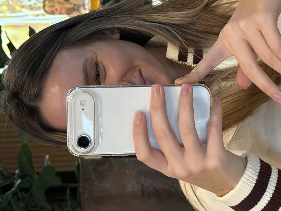 A female individual is depicted from the chest up, positioned indoors in the city of Dub, Montenegro. She is holding a white smartphone, encased in a clear protective cover, directly in front of her face. Her right eye and the right side of her smiling mouth are visible to the right of the phone. Her light brown hair falls around her shoulders, and she is wearing a light-colored, possibly cream, zippered jacket with a ribbed cuff featuring dark brown and cream stripes on her left arm. Her left hand supports the phone from below, while her right index finger rests near its right edge, possibly interacting with a button or screen. The phone's singular rear camera lens, a black circular element, is visible at the top. The background is significantly out of focus, revealing a large potted plant in a dark brown planter to the left and a blurry blonde individual with a glass beverage to the far right, suggesting a cafe or restaurant environment.
