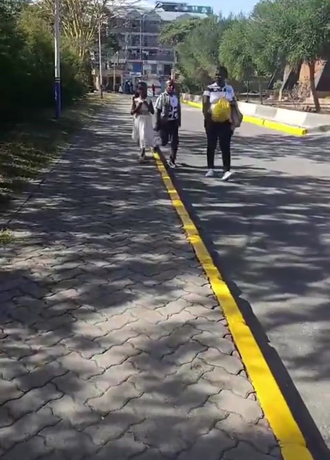 three people walking along a sidewalk on a sunny day. The sidewalk is paved with gray interlocking bricks and has a yellow line painted along the edge. A girl in a white dress walks in front of a boy wearing a vest over a white jersey. An adult woman in black pants and a white shirt walks behind the two children. There are trees and bushes along the side of the sidewalk. In the background, there is a building with scaffolding. The camera moves along with the people, keeping them in frame.