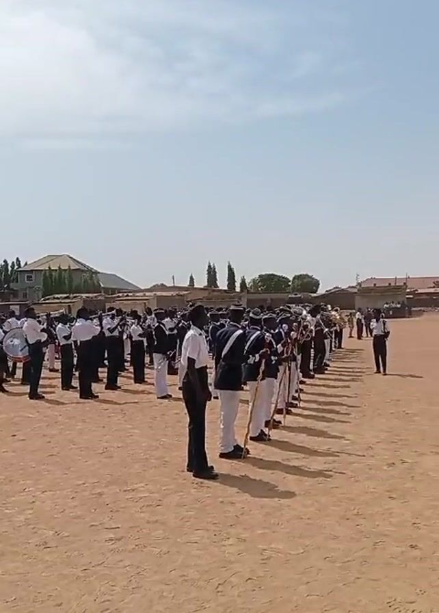 A uniformed marching band stands in lines on a dirt field. The band members wear black and white uniforms and are holding instruments like drums, trumpets, and batons. Some members are bowing their heads. In the background, there are buildings and trees under a clear sky. The camera angle is stationary and captures the entire band.