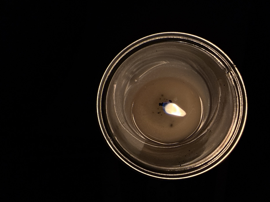 - "A single, lit candle in a clear glass votive holder is depicted from a top-down perspective against a solid black background" by FM-Owchx2, licensed under CC BY 4.0