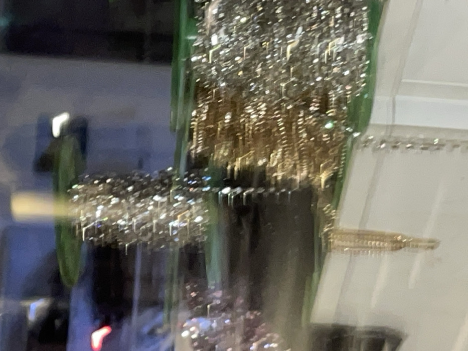 The image contains a blurry, abstract composition. Shiny, reflective elements in silver and gold tones appear densely packed, possibly tinsel or glitter. These are partly obscured by a dark, vertical form. There's a hint of green running along the sides, perhaps a container or border. The background includes indistinct shapes and colors, suggesting an out-of-focus scene. The overall impression is shimmering and festive, but the lack of clarity makes specific identification challenging.