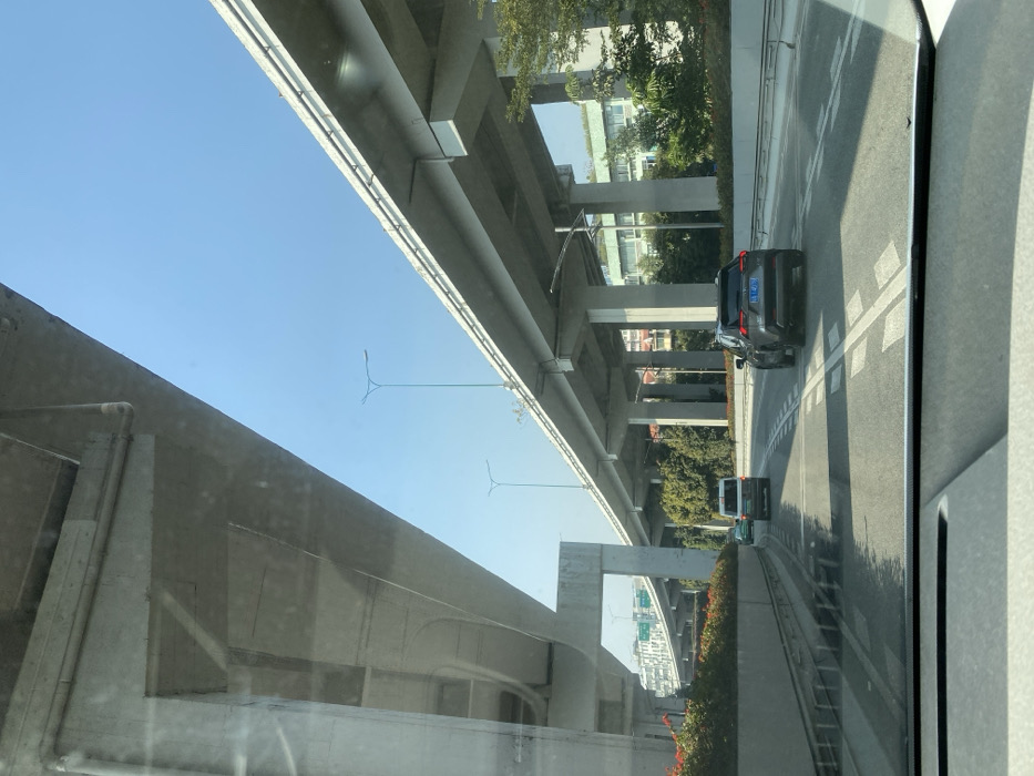 An urban landscape seen from inside a vehicle. An elevated roadway stretches overhead with pillars supporting its structure. A car drives on the road parallel to the elevated structure. Streetlights with a distinctive “Y” shape are visible between the elevated roadway and the horizon. The sky is visible between the roads, the elevated structure and the side of the vehicle. Other buildings and trees are visible in the background.