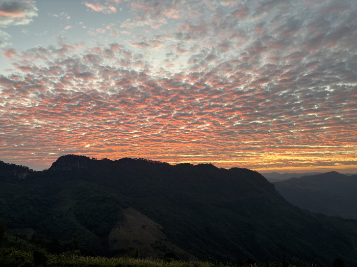 A scenic view captures a mountain range silhouette against a vibrant sunset. The sky showcases a dense, rippled cloud formation illuminated with hues of orange and pink, contrasting against a cooler blue above. In the foreground, dark, forested hills descend into lower elevations, providing depth to the landscape. Distant, hazy mountain peaks fade into the horizon, enhancing the expansive feel of the scene.