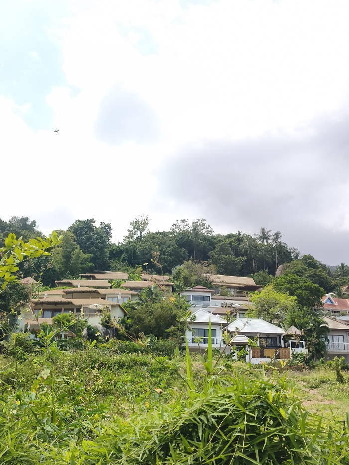 This image depicts a terraced hillside scene in Baan Hua Thanon, Thailand, dominated by lush tropical vegetation and residential or resort-style structures. The foreground features dense, bright green foliage, including broad leaves and slender bamboo-like stalks, obscuring the lower portions of the scene. In the mid-ground, multiple multi-story buildings are integrated into the hillside, arranged in a terraced fashion. Many of these structures exhibit light-colored facades and distinctive thatched roofs, blending with the surrounding greenery. Further down the slope, some buildings feature modern white, sloped roofs and prominent windows or balcony railings. The hillside behind these structures is densely covered with tall, dark green trees, forming a thick canopy. The sky above is partially cloudy, with large, diffuse grey and white clouds interspersed with patches of lighter blue sky. A small, dark, elongated object, possibly a bird or distant aircraft, is visible against the sky in the upper left quadrant. No individuals or explicit actions are discernible.