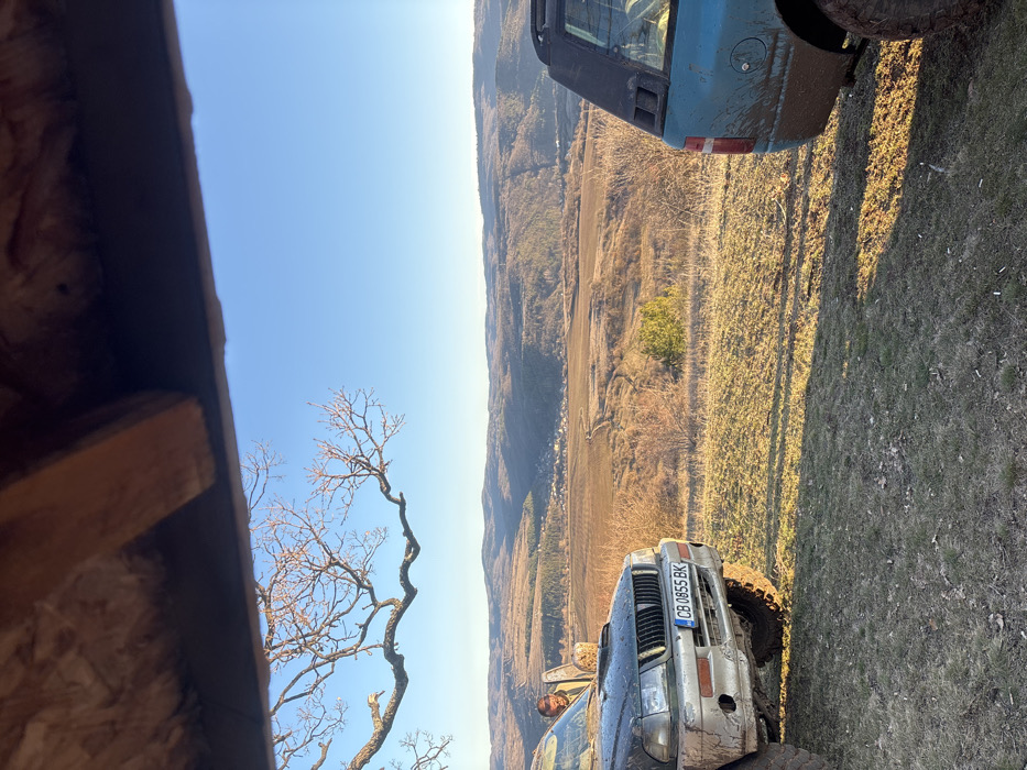 The scene depicts an outdoor landscape overlooking the village of Baylovo, Bulgaria, under a clear blue sky. The viewpoint is from beneath a wooden overhang structure, partially obscuring the top of the frame. In the immediate foreground, two mud-splattered off-road vehicles are parked on a dry, grassy hillside. On the left, a dark green Mitsubishi Pajero Sport SUV, heavily coated with mud, presents its front left quarter. The Bulgarian license plate "CB 0855 BK" is affixed to the front bumper. A black snorkel is visible on the passenger side A-pillar. The front passenger door is open, and a male individual wearing a camouflage-patterned jacket is partially visible, leaning into or interacting with the vehicle's interior. On the right, the rear quarter of a turquoise or light blue SUV, also heavily covered in mud, is partially visible. A large, muddy off-road tire is present. Beyond the vehicles, a valley unfolds into the distance. The terrain consists of dry, light brown fields and sparse, leafless deciduous vegetation. Winding dirt tracks traverse the landscape. In the mid-ground, the village of Baylovo is visible, characterized by clusters of buildings amidst the valley floor, framed by undulating, forested hills in the far background. A large, bare tree branch extends from the left side of the frame into the clear, cloudless blue sky.