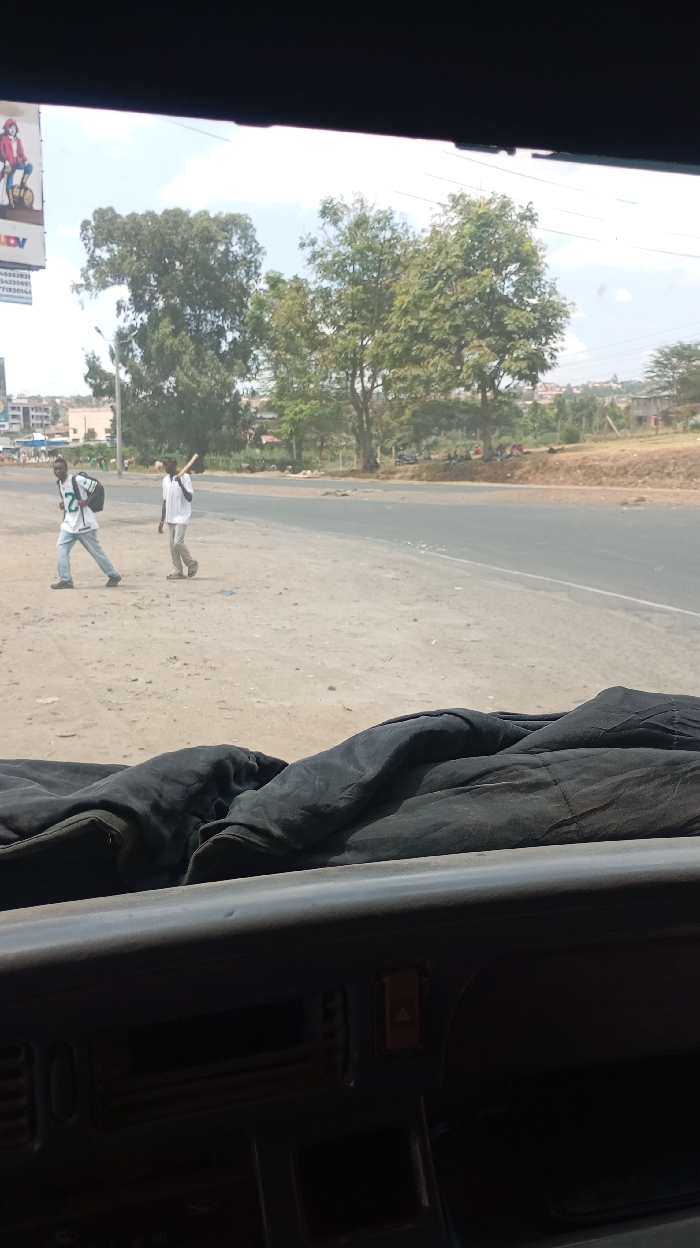 Two people walk along a sandy area next to a road. One carries a backpack and wears a jersey with a number on it. The other has a stick or bat over their shoulder. In the background, trees line the road, and buildings can be seen further away. The scene is viewed from inside a vehicle, with the dashboard and a dark, folded material visible in the foreground. A billboard is located on the left side of the image.