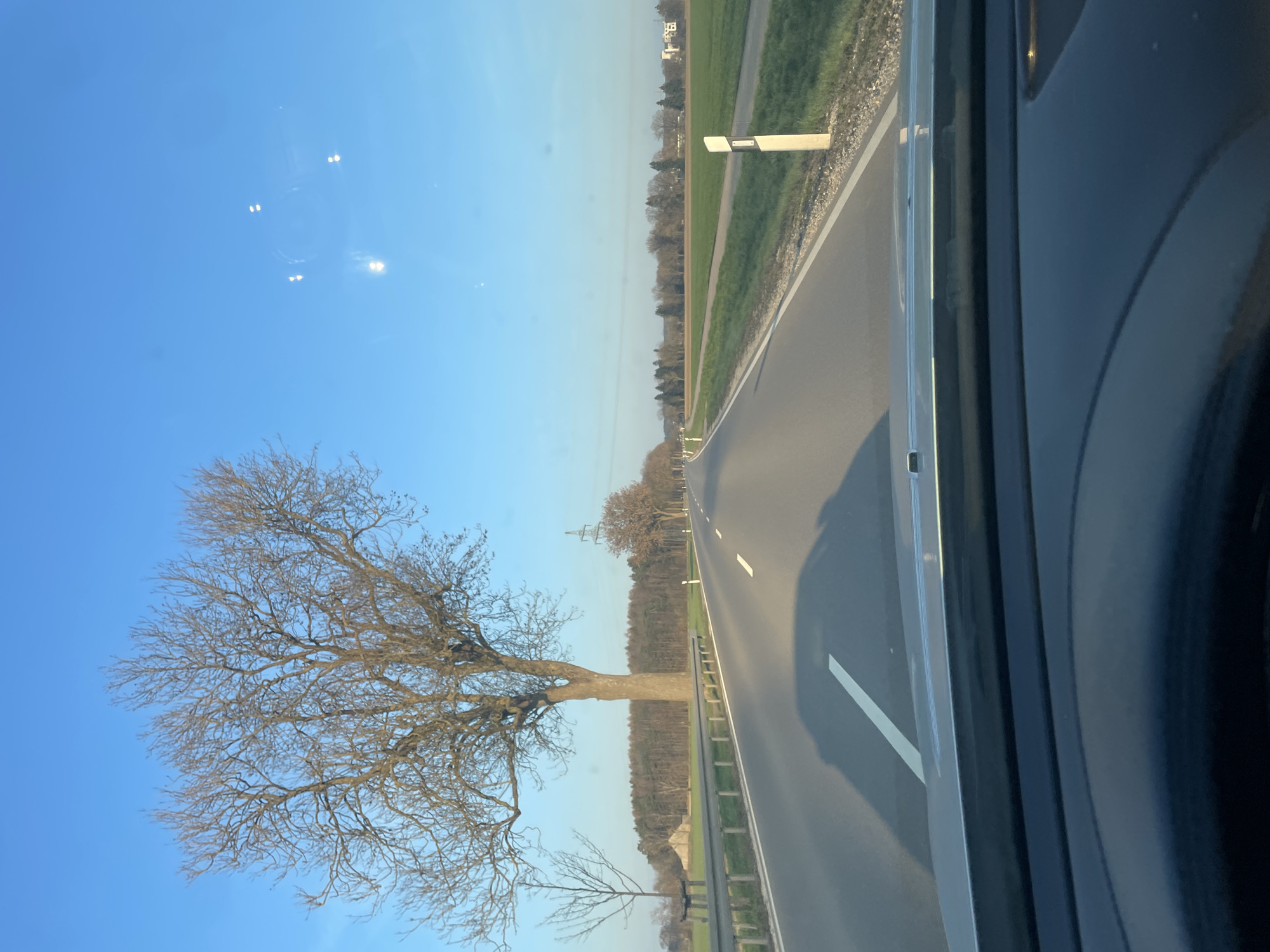 The image depicts a rural road scene, likely a state or district road, in the vicinity of Weißenhorn, Germany. The perspective is from inside a vehicle, looking forward through the windshield, with the dark dashboard visible at the bottom of the frame. The asphalt road, marked with a solid white line on the right shoulder and broken white lane lines, extends into the distance under a clear, bright blue sky. Several lens flares are apparent on the upper right portion of the sky, indicating direct sunlight. On the left side of the road, a metal guardrail runs parallel to the pavement. Beyond the guardrail, a wide grassy shoulder precedes a line of bare deciduous trees. A prominent, large, leafless deciduous tree stands close to the road. Further back and to the left, another smaller, bare deciduous tree is visible. Behind these trees, a light-colored, triangular agricultural structure (possibly a covered hay or silage pile) is situated in a field. A dense forest line forms the horizon on the left. A metal lattice power line tower is partially visible in the middle distance, behind the trees on the left. On the right side of the road, a grassy shoulder is marked by white and black reflector posts (Leitpfosten) placed at intervals. Beyond this, expansive green agricultural fields stretch towards the horizon. In the far distance on the right, indistinct building structures, consistent with a small town or village, are visible under the clear sky. No individuals or active interactions are visible. The scene suggests a clear, bright day during late autumn, winter, or early spring, given the bare trees.