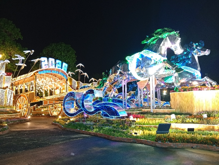 The image depicts a nighttime scene of a large, illuminated outdoor decorative display in Tuy Hòa, Vietnam. The central feature on the left is a representation of a traditional carriage or wagon, adorned with numerous warm white lights outlining its structure and filling its interior. Above the carriage, the numbers "2023" are illuminated in blue, with "ĐƯỜNG HOA TUY HÒA" (Flower Street Tuy Hoa) displayed beneath them. Several illuminated bird-like figures are positioned above and around the carriage. To the right, a large sculptural element features two geometrically faceted horses, constructed from reflective material and illuminated with vibrant blue and green lights, appearing to be in mid-stride. These horse sculptures are situated on a raised platform with a textured, light-colored base, possibly bamboo. The foreground and midground consist of a dark asphalt pathway curving through the scene. Bordering the path are extensive landscaped flower beds filled with various plants and flowers, predominantly in shades of yellow, orange, and green. These flower beds are illuminated by multiple small ground lights. Several dark, rectangular objects, resembling solar panels or ground-mounted light fixtures, are visible within the flower beds on the right side. The background consists of a dark night sky with some tree foliage visible, dimly lit by the display. No individuals are present in the frame.