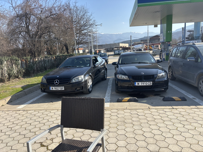 The image displays a static outdoor scene at a gas station parking area in Berkovitsa, Bulgaria, under a clear, sunny sky. In the immediate foreground, a dark grey/black wicker-style chair with silver metal arms is partially visible from behind, facing away from the viewer. The ground is paved with hexagonal light-colored concrete pavers. In the midground, three vehicles are parked. To the left, a black Mercedes-Benz CLC-Class coupé (license plate M 9827 BP) is parked facing the viewer in a designated spot, next to a grassy area with low green hedges and bare deciduous trees. To its right, a black BMW 3 Series sedan (license plate M 1910 CB) is also parked facing the viewer in a spot marked with white lines, with yellow and black striped wheel stops positioned in front of its tires. To the far right, a dark grey station wagon or minivan is partially visible, parked facing right. An overhead gas station canopy, supported by green and blue pillars, extends over the BMW and the adjacent grey vehicle. A number "43" is visible on one of the canopy pillars. In the background, beyond the gas station, industrial-type structures including silos and machinery are visible. A snow-capped mountain range rises on the distant horizon, consistent with the Balkan Mountains surrounding Berkovitsa. No individuals are present in the frame.