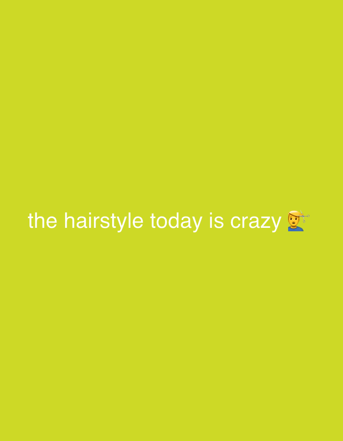 The image displays a digital graphic on a solid, uniform lime green background. Centered horizontally in the lower half of the frame is white text that reads: "the hairstyle today is crazy". Immediately following the word "crazy" are two emojis: a blond person with a visible head and shoulders, facing forward, and a small depiction of open scissors and a comb positioned adjacent to the person's head, suggesting a hair-related theme. No physical location, including Rakitnitsa, Bulgaria, is discernible within the image content. No actual people or discernible actions are depicted.