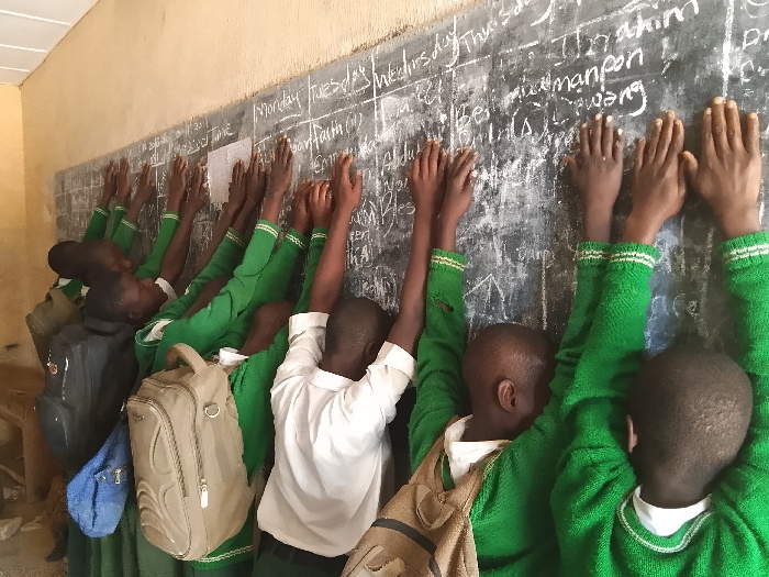 Approximately ten individuals, predominantly children, are depicted within an indoor classroom setting in Jos, Nigeria. They stand facing a dark, chalk-covered wall, identified as a chalkboard, which is mounted beneath a plain light-beige wall. Each individual has both arms extended vertically, with open hands pressed flat against the chalkboard. Most are viewed from the back, wearing green long-sleeved sweaters, some showing visible wear and a white collar underneath, indicative of school uniforms. One individual on the right wears a white short-sleeved shirt. Several are equipped with backpacks; a prominent light-tan backpack, a black backpack, and a blue fabric bag are visible. The chalkboard displays various white chalk markings, including days of the week (e.g., "Monday," "Tuesday," "Wednesday," "Thursday," "Friday") and names such as "Ibrahim," "Faith," "Emma," "manpon," and "wang." The collective posture suggests a structured activity.