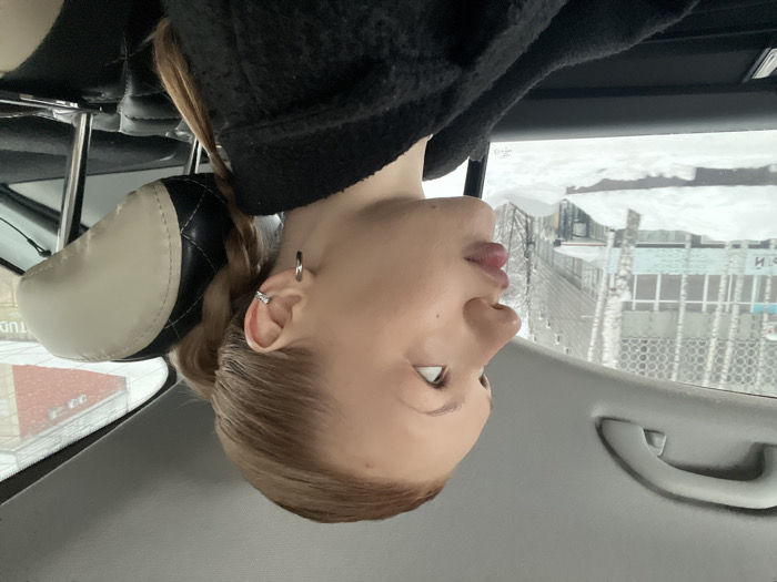 The image depicts a young female observed in profile from her right side, seated inside a vehicle. She has light-colored hair pulled back into a ponytail and wears a silver hoop earring in her right earlobe and a silver ear cuff on her right helix. Her eyes are directed upwards, and her lips are slightly parted. She is wearing a dark, textured coat or jacket. The vehicle's interior shows a light-colored grab handle on the ceiling and a partially visible beige and black quilted headrest. The exterior environment, viewed through the vehicle window, is a snow-covered urban street in Chaikovsky, Russia. The ground is covered in deep snow. To the left, a multi-story building with a light-colored, patterned facade and multiple windows is visible, with a partially visible Cyrillic character "Й" on its lower section. Further down the street and to the right, a building with a reddish, brick-like exterior features a sign with the partial English word "TUDIO." Bare trees are interspersed among the buildings, also covered in snow. The lighting is consistent with an overcast winter day.