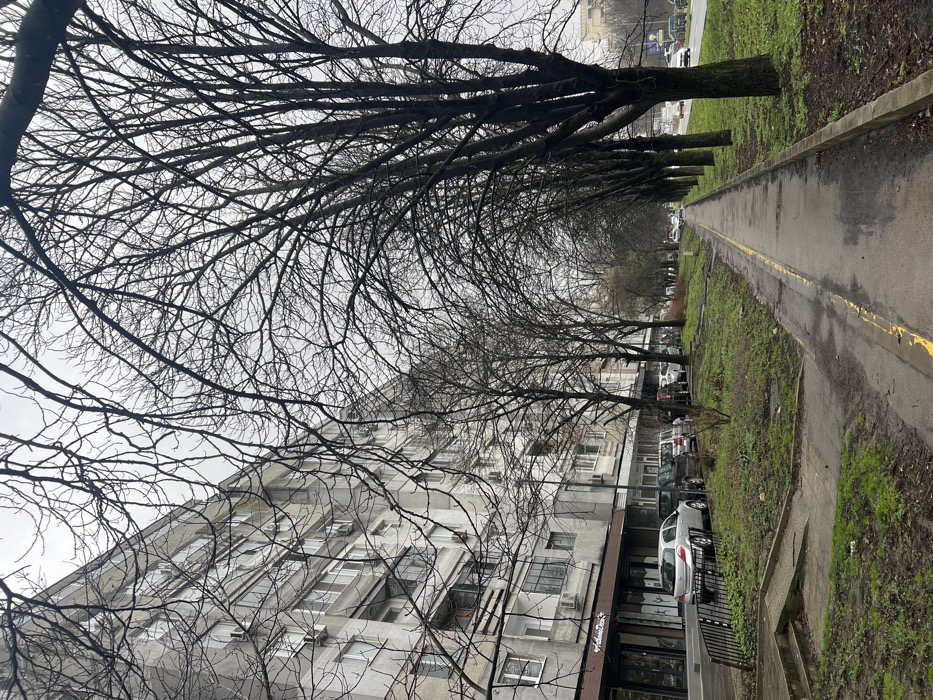 An urban street scene in Varna, Bulgaria, specifically on Tsar Osvoboditel Blvd, near building number 27. The photograph depicts an overcast daytime environment, characteristic of late autumn or winter, indicated by the bare deciduous trees. To the left, a multi-story, concrete residential building, approximately eight stories high, features numerous windows and several external air conditioning units. The ground floor houses commercial establishments with dark window facades, one prominently displaying a sign that reads "Adam&Eve." Parked parallel to the curb in front of these shops are several vehicles, including a silver Opel Astra hatchback in the foreground, followed by a dark SUV and other sedans. In the middle ground, a narrow, unkempt grassy median strip separates the parked vehicles from a wide pedestrian sidewalk. This median contains patches of sparse green grass, bare earth, and small shrubs. A row of bare, dark-branched deciduous trees lines the median, their intricate branches extending into the upper portion of the frame, partially obscuring the sky and upper floors of the building. The concrete sidewalk, showing signs of wear and dirt, extends into the distance, marked by a faded yellow line along its inner edge. In the immediate foreground, a small set of concrete steps and a black metal railing are visible, descending from the sidewalk to a lower, muddy area. To the right of the sidewalk and tree-lined median, a multi-lane asphalt road is present, with several vehicles in motion, indicating active traffic flow. No individuals are clearly visible within the scene.