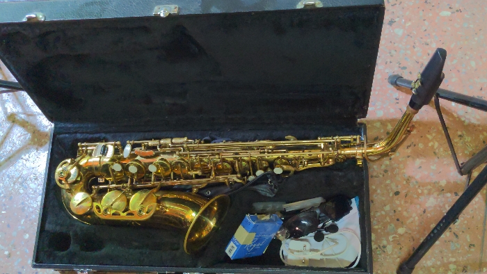 - "A golden saxophone rests inside an open, black hard case" by FM-QrecA3, licensed under CC BY 4.0