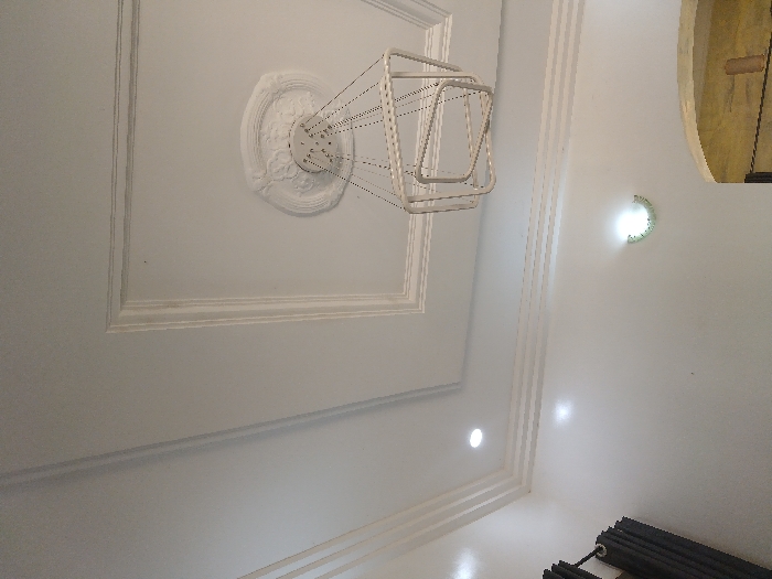 Location: City of Unknown, Unknown. This image captures an upward-angled view of an interior room's ceiling and upper wall sections. The ceiling is white and features a multi-tiered rectangular recessed panel with decorative trim. Centrally within this panel, an ornate white circular ceiling medallion is affixed. Suspended from the medallion is a modern chandelier composed of three nested, open-frame white squares. Illumination is provided by the chandelier, a single recessed white LED spotlight in the ceiling to the left, and a semi-circular wall sconce on the right wall emitting an upward glow. The walls are white. In the lower left quadrant, a section of a dark-colored curtain, possibly charcoal or black, is visible, hanging from a rod with visible grommets. The lower right reveals a partial view of a curved archway leading to an adjacent area, showing a glimpse of a light-colored, possibly yellowish, ceiling or upper wall. No individuals are present.