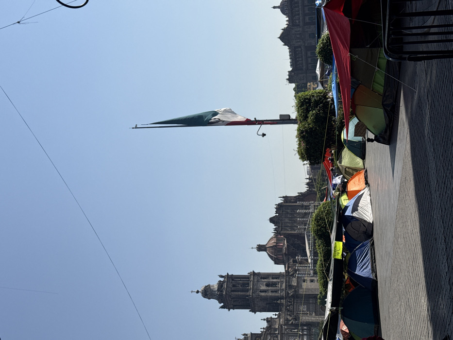 The scene depicts the Zócalo (Plaza de la Constitución) in Mexico City, Mexico, under a clear blue sky