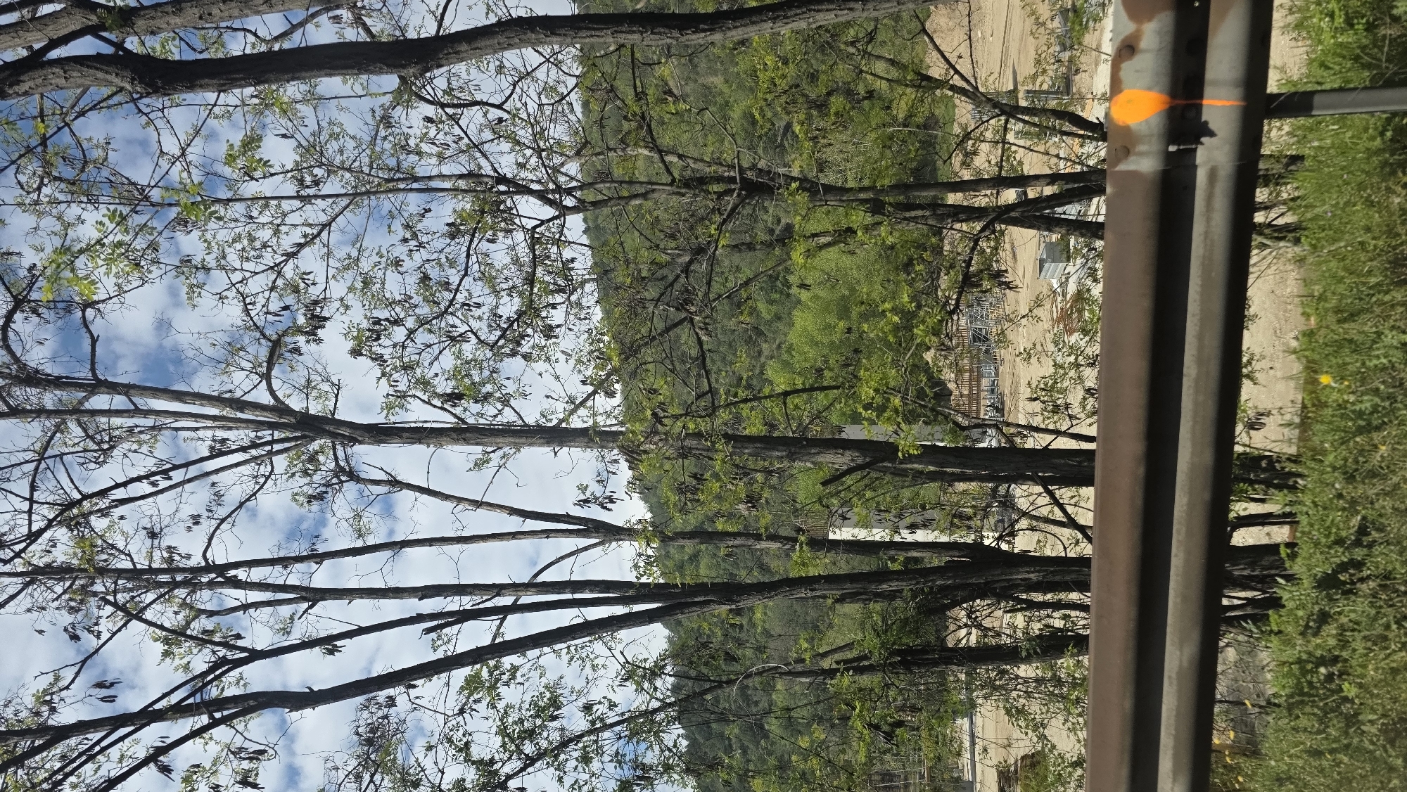 view through trees in Kresna, Bulgaria. A metal guardrail is present on the right side of the frame, with a blurred orange marker on it. Behind the trees, a construction site is visible, with dirt and metal framework. A mountain covered in green vegetation rises in the background. The sky is visible through the branches, featuring a mix of blue and white clouds.