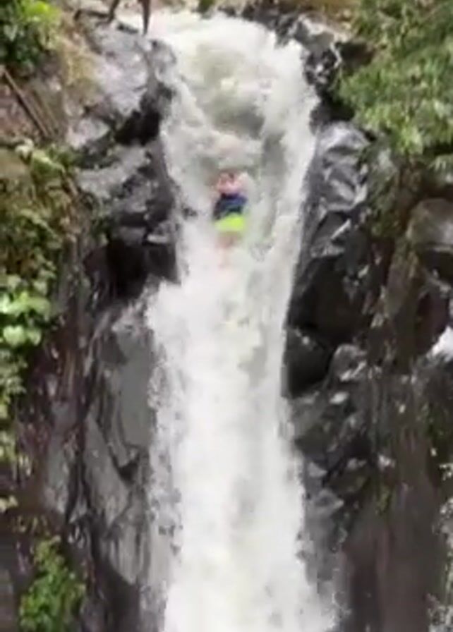 person sliding down a waterfall into a pool of water. The waterfall is surrounded by rocks and vegetation. There are two other people at the bottom of the waterfall watching. One person, standing near the waterfall, has long red hair. The other person is out of focus. There is a sign to the right of the waterfall.