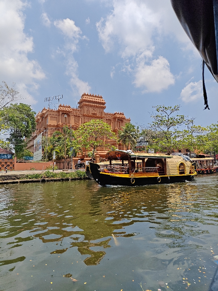 The image presents a daytime scene along a canal in Alappuzha, Kerala, India, under a blue sky with scattered cumulus clouds