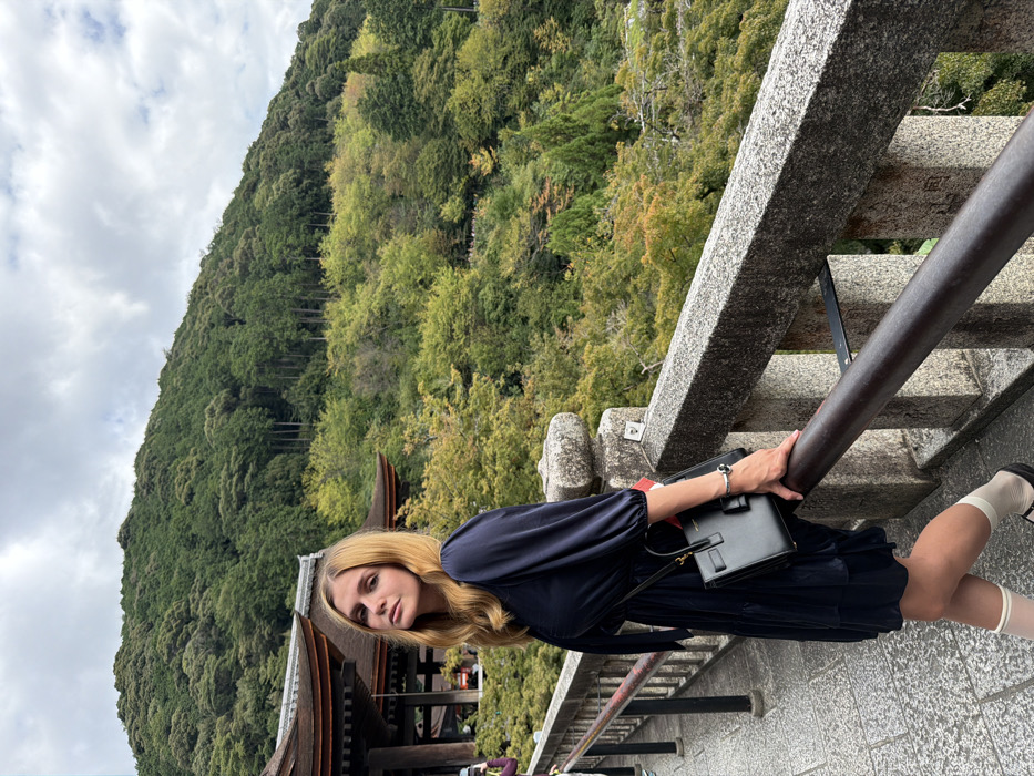 A young adult female is depicted standing on a stone pathway at Kiyomizu-dera Temple in Kyoto, Japan. She has long blonde hair, fair skin, and is looking directly at the camera. Her attire consists of a navy blue long-sleeved tiered dress with a bow tied at the neckline, white knee-high socks, and black Mary Jane-style shoes. She carries a black leather shoulder bag with gold-toned hardware on her left side and wears a silver-toned bracelet on her right wrist. Her right arm rests on a dark brown wooden handrail, which is part of a rugged stone balustrade running horizontally across the mid-ground. To the left of the subject, a traditional Japanese temple roof structure with dark tiles and ornate wooden eaves is partially visible. The scene overlooks a steep valley and hillside covered with dense deciduous and coniferous forest, displaying various shades of green and early autumn yellowish-green foliage. A heavily forested mountain rises in the distant background, filling the upper portion of the frame under an overcast sky with scattered white and grey clouds. A partially visible individual, dressed in a purple garment, is visible on the far left behind the main subject, holding what appears to be a mobile device.
