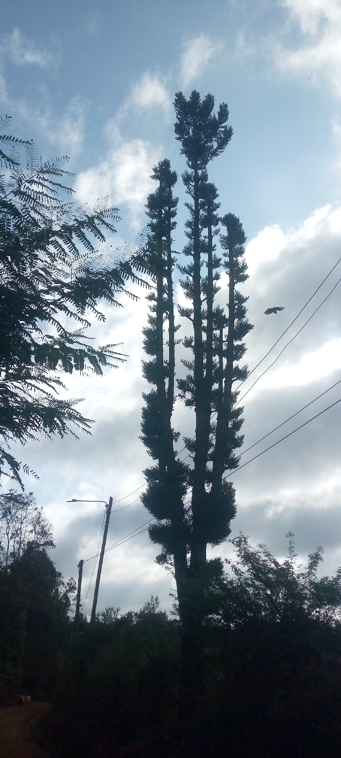 A tall, multi-trunked tree or cell tower disguised as a tree dominates the frame against a sky with scattered clouds. It's surrounded by other vegetation and foliage in the foreground. Power lines stretch across the sky, and a bird is flying in the distance. A lamppost is visible in the background on the left. The lower portion of the image is dark, obscuring the ground and the immediate base of the objects.