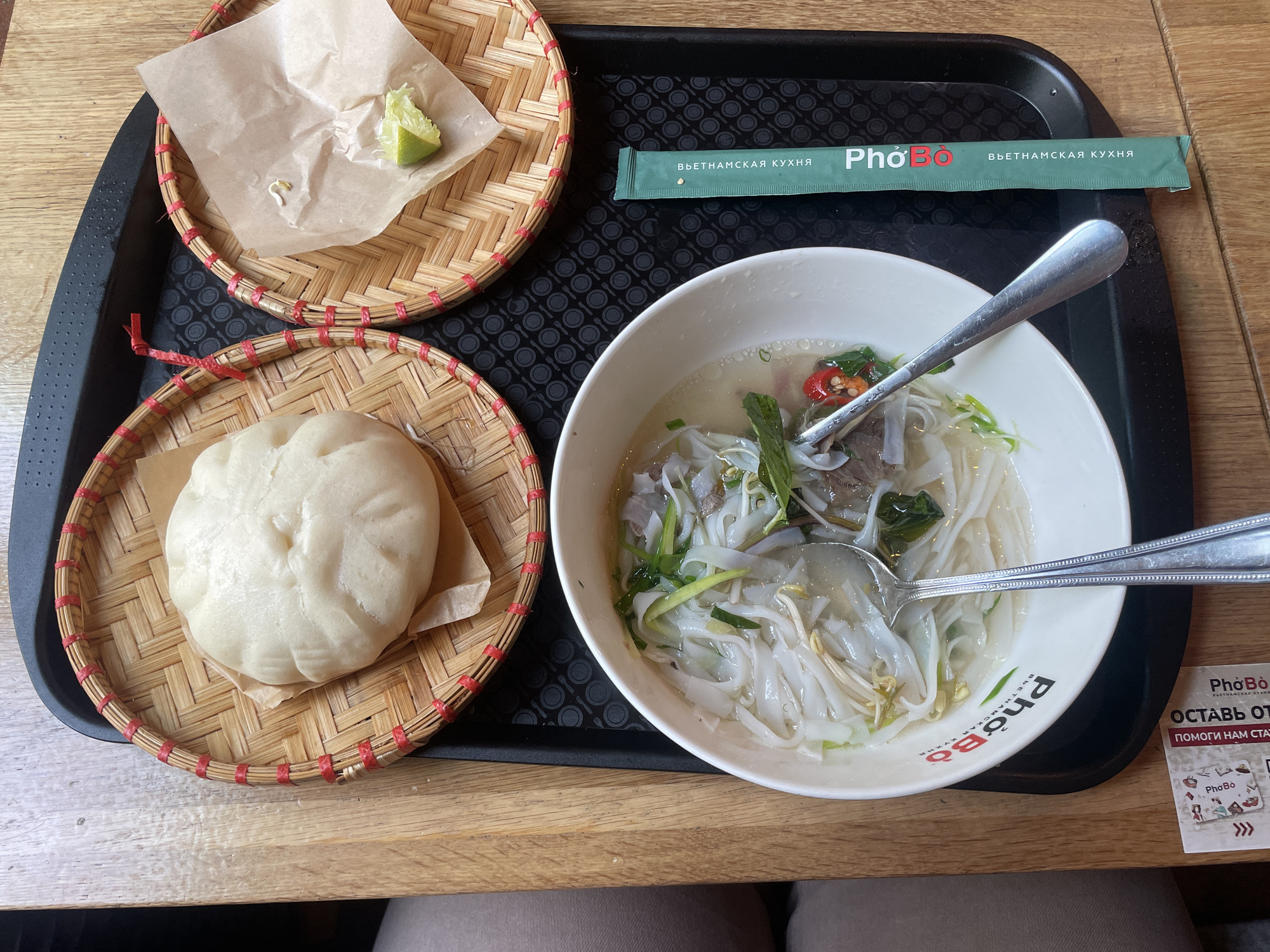 A top-down view shows a Vietnamese meal served on a black plastic tray, resting on a light wooden table. The main subject is a white bowl of Pho Bo, containing a clear broth with flat rice noodles, sliced beef, bean sprouts, green onions, and red chili slices. A metal spoon is partially submerged in the bowl. To the right of the Pho, two round, woven bamboo baskets with red trim are present. One contains a large white steamed bun on a piece of brown parchment paper. The other, smaller basket holds a lime wedge and a single bean sprout, also on parchment paper. A long, green packet with "PhoBo" and "ВЬЕТНАМСКАЯ КУХНЯ" (Vietnamese Cuisine) printed in Russian is situated on the tray. In the lower-left corner, a white and red paper card with the "PhoBo" logo and Russian text, including "ОСТАВЬ ОТЗЫВ" (Leave a review), is visible on the table. A portion of a person's leg, clothed in light fabric, is visible on the far left edge of the frame. Based on the Russian text and the "PhoBo" branding, the location is a PhoBo restaurant in Moscow, Russia.