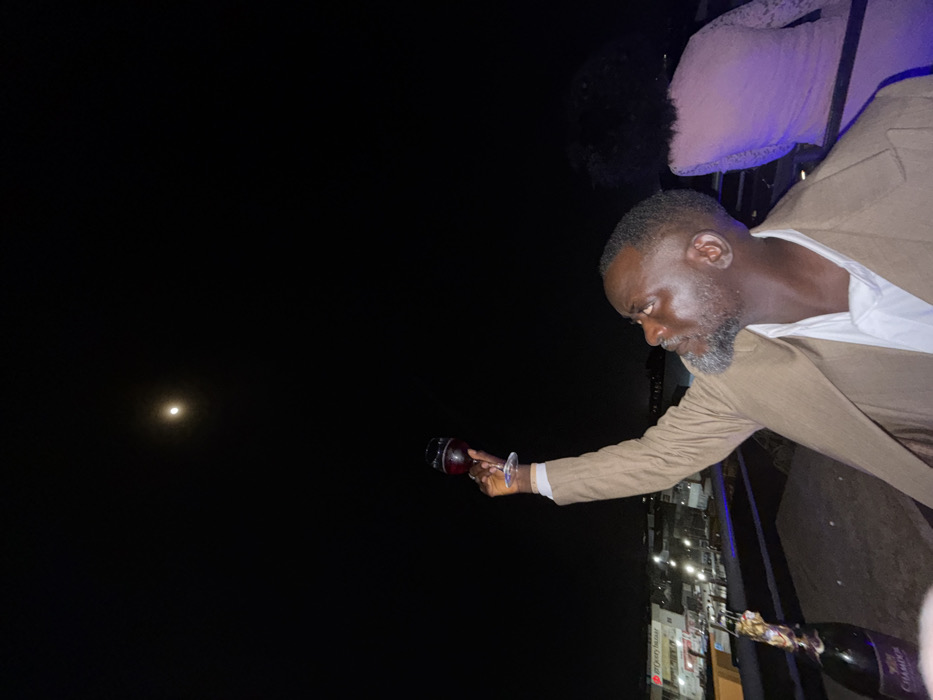 A man in a tan suit and white shirt holds a glass of red wine toward a small moon in the night sky. The background shows a city skyline at night. A champagne bottle is visible at the bottom of the frame, suggesting a celebration. The overall composition creates a surreal and celebratory atmosphere.