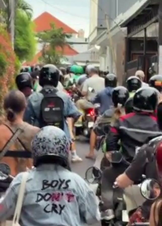 street congested with motorbikes. Most riders are wearing helmets. A woman in front wears a jacket with "BOYS DON'T CRY" printed on the back. Some riders have backpacks. Buildings are seen on both sides of the road, and foliage is visible on the left. The scene appears to be a traffic jam.