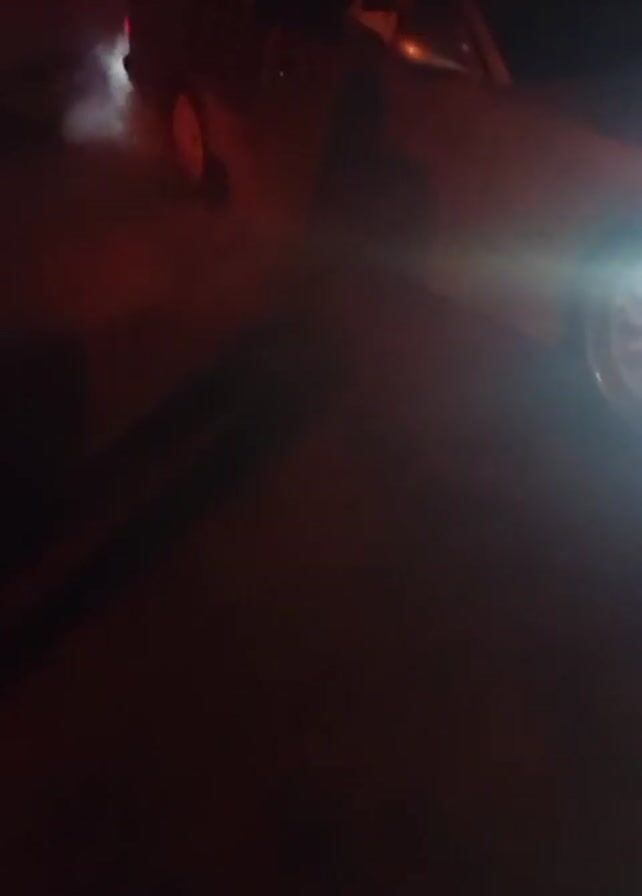 At night, a dark-colored car accelerates and then burns rubber. The car faces the camera, with only its driver-side headlights visible due to the darkness. The tires spin and create smoke, lit with red lights. The camera is close to the right-side headlight, which is clearly visible.