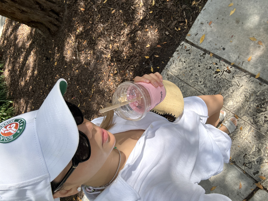 A top-down shot captures a person in a white outfit, including a cap with a logo, holding a plastic cup with a straw
