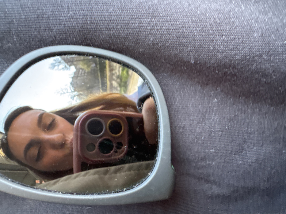 A close-up image depicts the reflection within a small, ovoid mirror, which is mounted against a dark grey, coarsely textured fabric surface. **In the reflection:** A person, appearing to be female, with long brown hair, is visible from the chest upwards. She has her eyes closed and lips pursed in a kissing gesture, looking downwards towards a smartphone she holds in her right hand. The smartphone, encased in a muted pink or reddish protective case, displays multiple circular camera lenses, one with a yellow rim. Her left arm and shoulder are partially visible, covered by an olive green or brown jacket. **Reflected background environment:** Beyond the person, an outdoor daytime scene is visible. The bright sky is partially obscured by the tops of deciduous trees, some appearing bare or sparsely leafed, indicative of late winter or early spring. Structures, possibly urban buildings, are discernible in the distance among the trees. A body of water, potentially a canal or river, runs horizontally across the mid-ground, flanked by green vegetation on its bank and a light-colored path or road. **Mirror and immediate surroundings:** The mirror itself has a light grey frame, with visible dust or small particles along its inner edge. The surrounding dark grey fabric, which occupies the majority of the image outside the mirror, shows numerous flecks of lint and a distinct woven texture. **Location:** This scene is situated in the Palilula Urban Municipality, Serbia. The reflected urban landscape with visible trees, buildings, and a body of water is consistent with areas within Palilula that feature mixed residential zones, green spaces, and waterways like canals or sections along the Danube River.