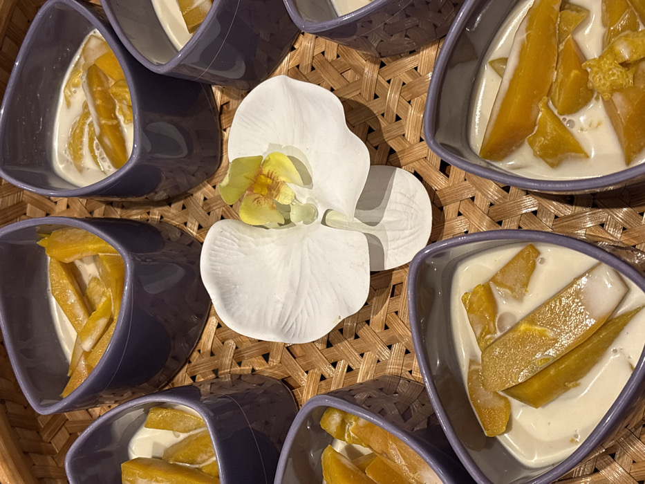 The scene, set in Suthep, Thailand, presents a static arrangement of eight individual dessert portions on a light brown woven mat. Each portion is contained within a purple, irregularly shaped ceramic bowl. The bowls hold bright yellow-orange pieces of cooked fruit, consistent with pumpkin or sweet potato, partially submerged in a white, creamy liquid, characteristic of coconut milk. Centrally positioned on the woven mat, surrounded by the dessert bowls, is a single white artificial orchid flower featuring a yellow and orange center. The woven mat exhibits a diagonal criss-cross pattern. No individuals are present, and no actions are depicted within the image.