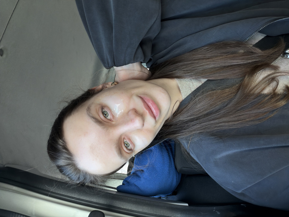 The scene is located in Brajici, Montenegro, inside a vehicle. An adult female is seated in what appears to be the passenger seat, captured in a medium close-up. She has long, dark brown hair, light-colored eyes, and a fair complexion, exhibiting a faint smile. Two translucent under-eye patches are present beneath her eyes. She wears a light-colored top under a dark grey or black zippered jacket. A small gold earring is visible on her right ear, and a silver necklace with two small pendants hangs around her neck. Her left hand is positioned behind her neck. A dark blue fleece pillow is situated behind her, resting against a dark vehicle seat. The vehicle's interior features a light-colored pillar and headliner.