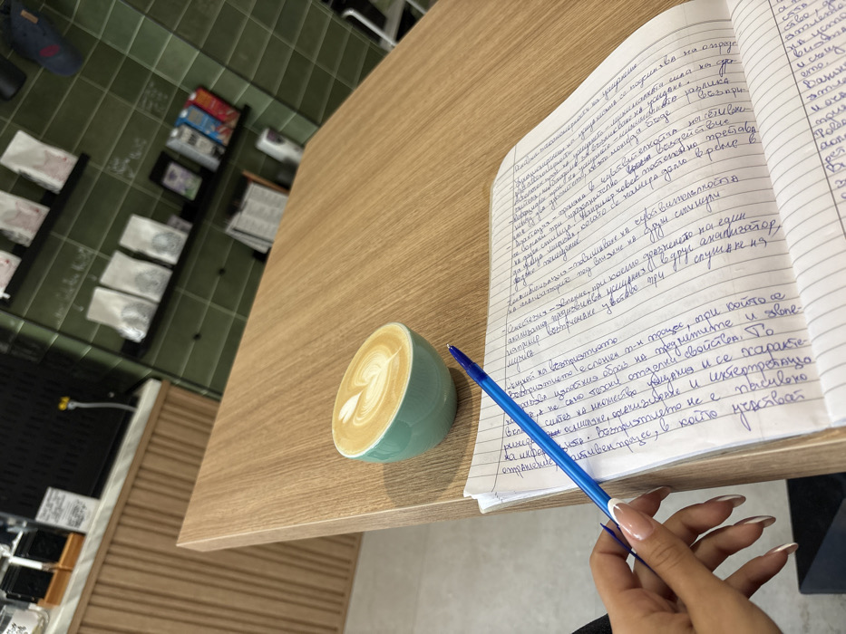 The image depicts a close-up scene inside Coffee Culture, a coffee shop located in Varna, Bulgaria. In the foreground, a light-colored wooden table serves as the primary surface. An open, lined notebook with handwritten text in Cyrillic script occupies the lower right portion of the table. A left hand, featuring manicured nails with a white tip design, holds a blue ballpoint pen over the notebook, indicating an act of writing or studying. To the left of the notebook, a turquoise, handleless ceramic cup filled with a latte, exhibiting a heart-shaped latte art design on its surface, rests on the table. The background reveals the interior of the coffee shop, characterized by a distinct dark green tiled wall with a grid pattern. Black shelves are mounted on this tiled wall, displaying several white packaged bags, likely containing coffee beans or related products, alongside other assorted merchandise and items. To the far left, a light-colored wooden counter with vertical slat detailing is partially visible, topped by a dark-colored espresso machine and other equipment.