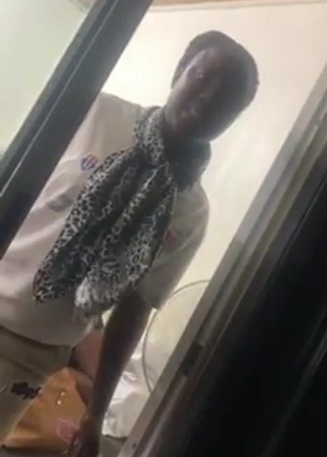 A person is seen through a doorway, dressed in a white t-shirt, light-colored pants, and a black-and-white leopard print scarf. They are standing in what appears to be a room with light walls and a wooden ceiling. Visible objects in the room include a tan handbag, a white fan, and a chair. The person is looking towards the camera and appears to be speaking. The view is from inside a room, looking out through a partially opened door.