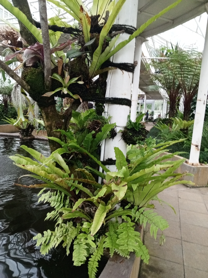 Lush green plants thrive beside a reflective pool within a greenhouse. Bird's nest ferns and various ferns cascade from a faux tree secured to a white support column. The plants are accented with dark, fibrous material. Beyond, tall tree ferns line a walkway beneath a translucent roof structure. The image is well-lit, highlighting the textures and colors of the vegetation.