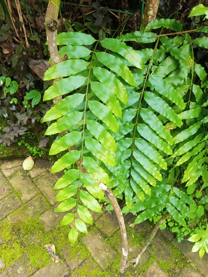 The image displays a ground-level view within the city of Kanand, India, featuring predominantly green foliage alongside a partially overgrown brick pathway. The central and upper portions of the frame are dominated by several large, compound leaves, exhibiting a bright to medium green coloration with visible parallel venation. These leaves appear smooth and slightly glossy. In the upper background, denser, darker green vegetation and thin brown branches are present. The lower half of the image consists of a paved surface constructed from rectangular, weathered bricks, which are substantially covered with bright green moss growing between the joints and on the brick surfaces. Scattered upon this paving are a few small, dried leaves, light brown to yellowish in hue. A slender, light brown branch, stripped of foliage, originates from the lower-center and extends upwards into the frame. No individuals, specific actions, or interactions are observable.