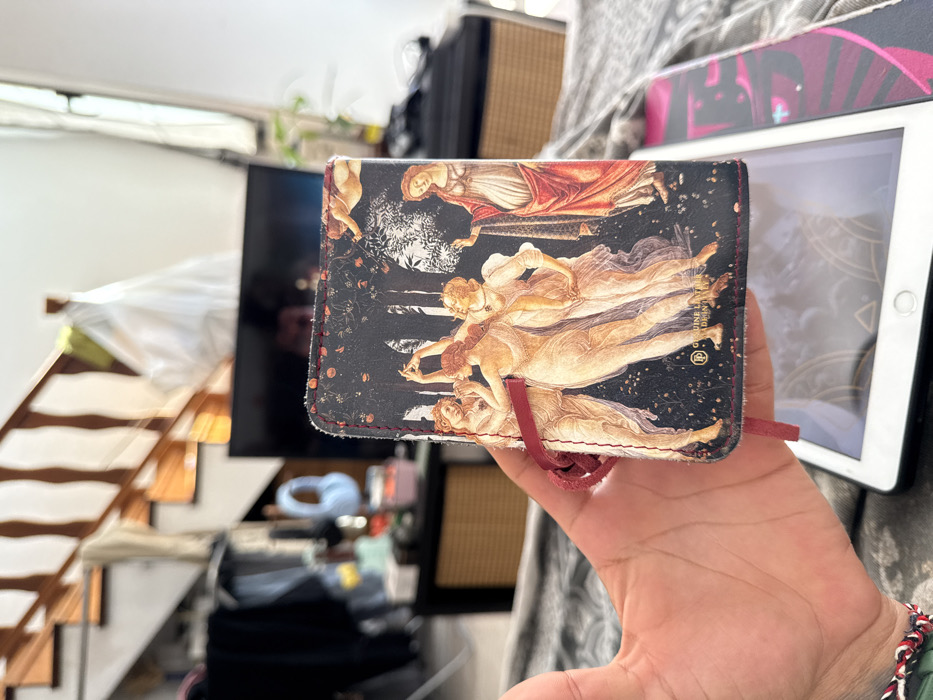 A hand, primarily visible from the palm and fingers, holds a small, rectangular notebook with a dark-colored leather cover. The cover displays a reproduction of a section of Sandro Botticelli's 'Primavera,' depicting the Three Graces, Flora, and a flying Cupid within a dark forested background featuring red fruit. The notebook has red perimeter stitching and a red ribbon bookmark. Small text at its base reads 'GENUINE LEATHER MADE IN ITALY'. Directly beneath the notebook, an off-white tablet displays circular motifs on its screen, resting on a patterned fabric surface. A partial view of an item with a pink and black geometric pattern is visible to the tablet's right. The blurred background depicts an interior residential space in Yaiza, Spain, featuring a large, dark flat-screen television centered above a low cabinet with a woven panel. To the left, a wooden staircase with light-toned balusters ascends. Various indistinct household items, including what appears to be hanging clothing and a light blue bag, are visible on a surface. A bright window area is present to the right.