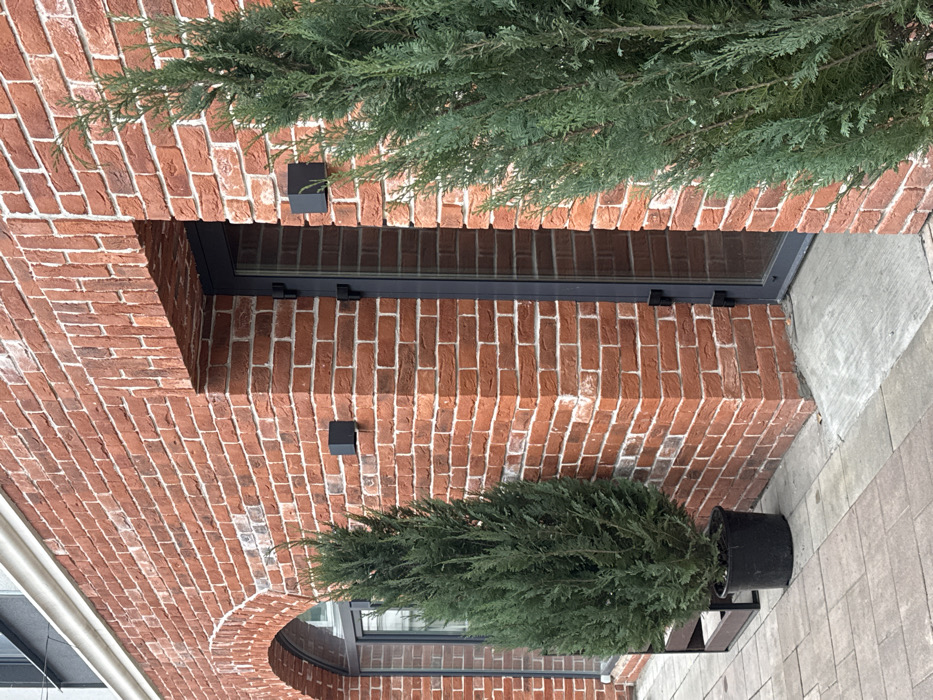 The image displays an exterior facade of a building located in Mahilyow, Belarus. The structure is constructed primarily from textured red brick with white mortar. The scene focuses on a building corner. To the left, a partially visible arched window with a dark frame is visible. Beneath this window, a dark brown wooden planter or bench is situated, with a cylindrical evergreen conifer in a black pot placed in front of it. Two dark, cube-shaped wall-mounted light fixtures are affixed to the brickwork, one on each side of the building corner. To the right of the corner, a full-height glass door with a dark frame and multiple visible hinges provides access to the building. A second evergreen conifer, similar in appearance to the first, is partially visible on the far right, obscuring part of the wall and the door. The ground surface consists of rectangular grey and brown interlocking pavers, transitioning to a grey concrete threshold at the building entrance. No individuals are present in the scene.