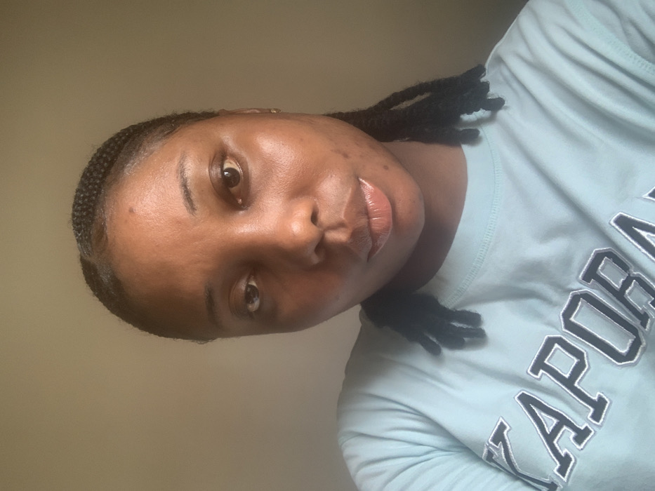 The image displays a close-up portrait of an adult female with dark skin. Her dark hair is styled in braids, with cornrows visible along the hairline. She looks directly into the camera with a neutral expression. Her lips appear glossy. She is wearing a light blue, long-sleeved t-shirt with dark lettering across the chest, partially visible, including the letters "KAPORA." The background is a plain, light beige-colored wall, indicating an indoor environment. The specific location within the city of Abuja, Nigeria, is not discernible from the visual information provided.