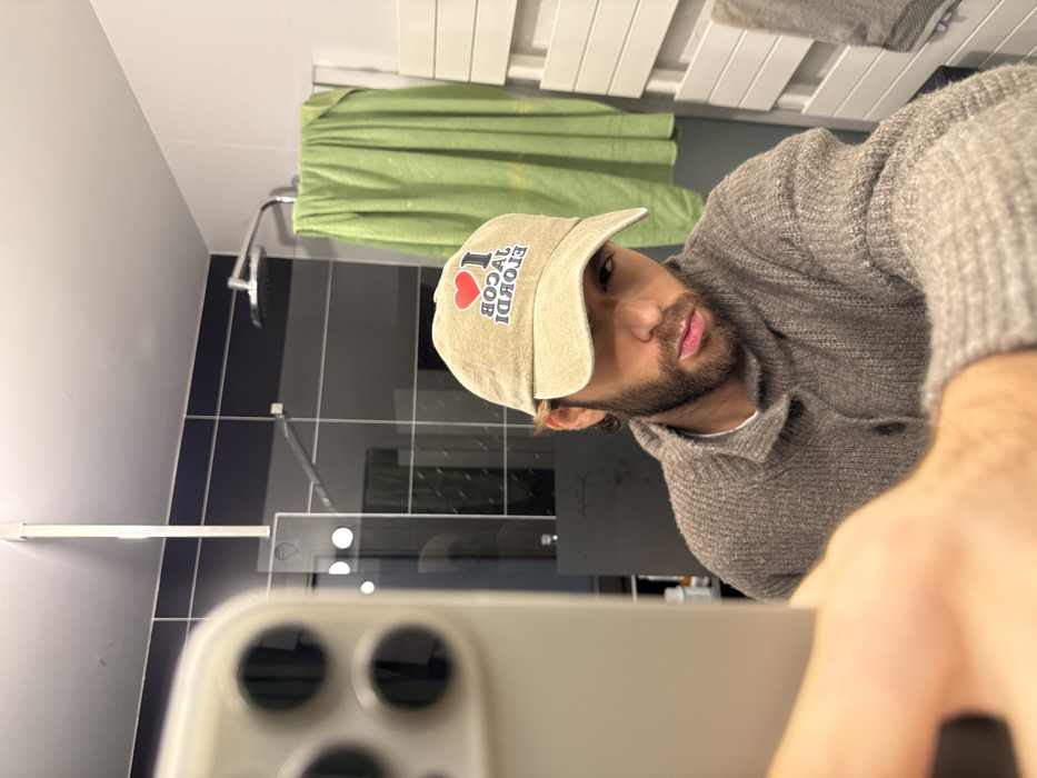 The image depicts a mirror selfie of an adult male taken in a modern bathroom setting, identified as being in Chambœuf, France