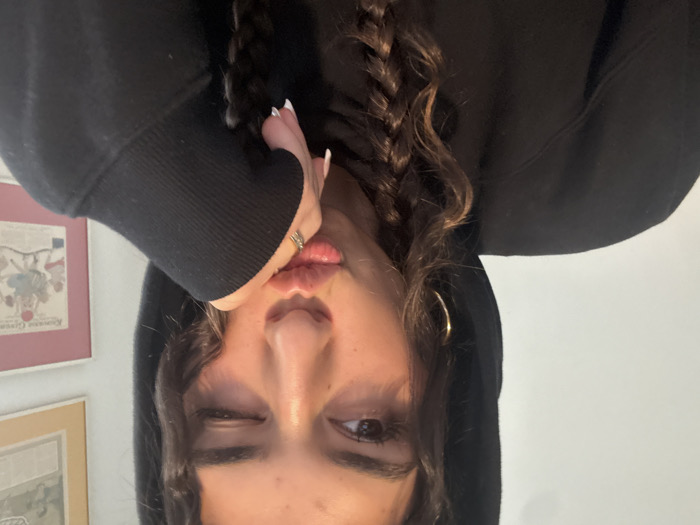 The image depicts a female individual, visible from the upper chest, within an indoor setting. She wears a black hooded sweatshirt with the hood raised, revealing dark, braided hair and gold-colored hoop earrings. Her right eye is closed in a wink, and her lips are pursed. Her right hand, featuring a silver-toned ring on one finger and white-tipped nails, rests near her chin. The background consists of a plain white wall on the left. On the right, a lighter wall displays two framed items: an upper light-toned document with dark text, and a lower multi-colored illustration depicting stylized figures. The precise location within Vancouver, Canada, is not discernible from the visual evidence present in the image.