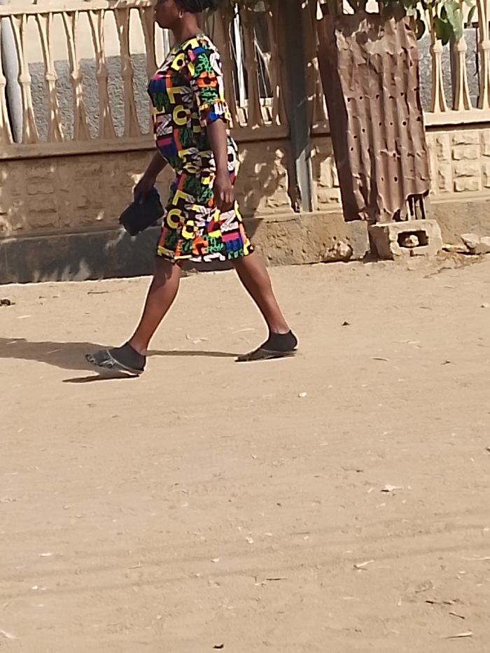 - "In Gwagwarwa, Nigeria, a single adult individual walks from left to right across an unpaved, light-brown dirt surface under direct sunlight" by FM-8iMFj1, licensed under CC BY 4.0