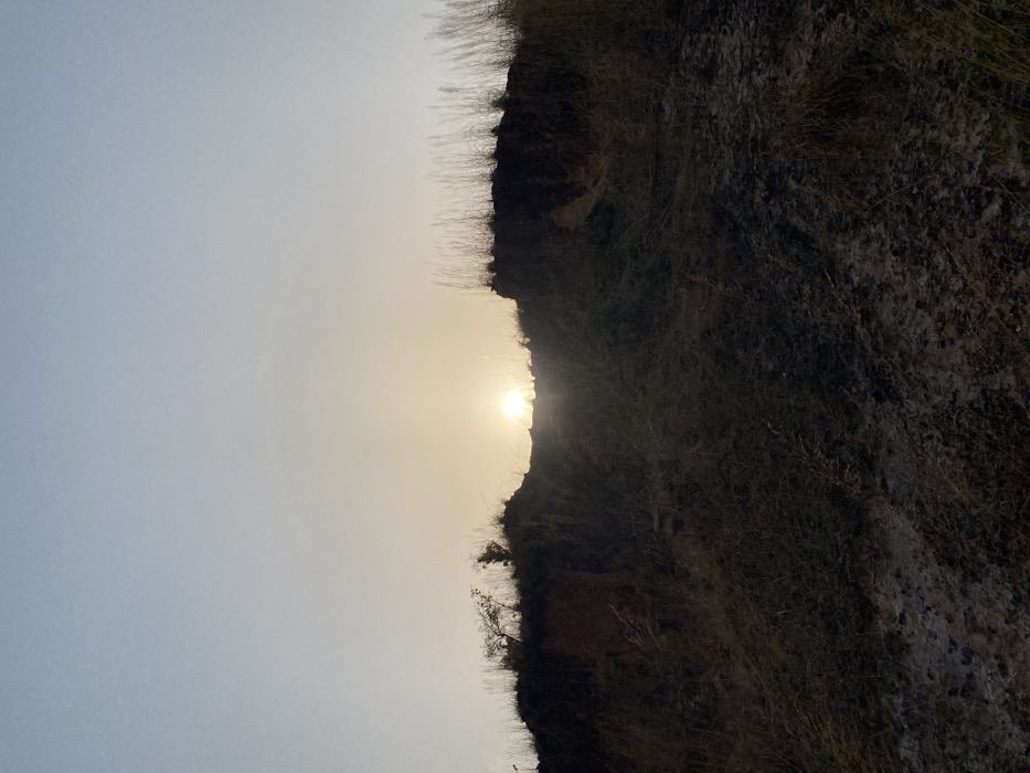 bright sun low on the horizon, peeking over the edge of a rugged, dark landscape. The landscape is characterized by rough terrain, likely covered in dry vegetation and soil. The sky fades from a light gray-blue near the top to a yellowish hue around the sun, suggesting a hazy atmosphere. The silhouette of the land creates a stark contrast against the sun.