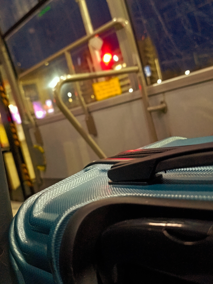The image presents an interior perspective from a public transport vehicle in Plovdiv, Bulgaria, during nighttime. A teal-colored hard-shell suitcase with a textured, ribbed surface and a black integrated handle/zipper component occupies the foreground, slightly out of focus. The vehicle's interior consists of light gray paneled walls and a curved, light-colored metal grab rail. Through the windows, an urban street scene is visible, centrally featuring a prominent red traffic signal light, indicating the vehicle is stationary. Various blurred points of light, consistent with streetlights and building illumination, are present in the distant background. A rectangular yellow sign with indistinct dark text is discernible beyond the grab rail, near the traffic light. No individuals are visible within the frame.