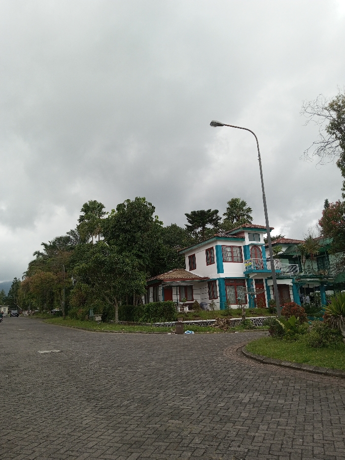 A cloudy day scene featuring a paved brick road curving around a patch of grass. A two-story white house with red and teal accents sits behind it, partially obscured by trees. A tall, silver lamppost stands near the house. Dense trees fill the background with hints of other buildings. The sky is heavily overcast with grey clouds.