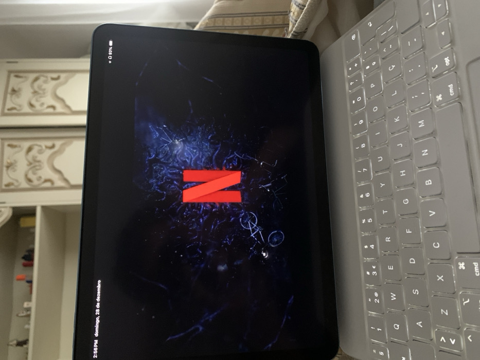 The image captures an electronic tablet, likely an iPad, positioned on a light grey keyboard case in an indoor setting within Macedo de Cavaleiros, Portugal. The tablet's screen displays the Netflix application's loading interface, featuring the prominent red "N" logo centered against a dark, abstract background with blue lighting effects and subtle, broken outlines resembling bicycles. The top left corner of the screen indicates "2:56 PM domingo, 28 de dezembro" (2:56 PM Sunday, December 28), while the top right corner shows a battery charge of 93%. The connected keyboard is a QWERTY layout with visible Portuguese character keys. In the background, a light-colored wooden cabinet with ornate, carved decorative panels is partially visible. To the left of the cabinet, a white shelf holds several small, indistinct objects. A striped, light-colored fabric element is visible to the immediate right of the tablet, and a white curtain or wall segment occupies the far right edge of the frame. No individuals are present in the scene.