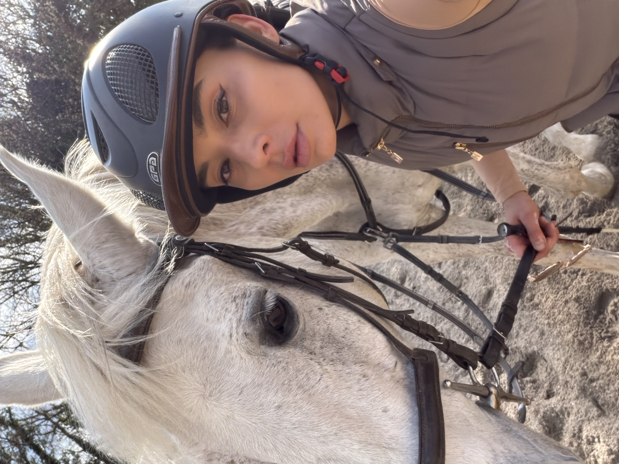 - "A person wearing a riding helmet and gray vest is seen in a close-up shot while on a white horse" by FM-rE8HA3, licensed under CC BY 4.0