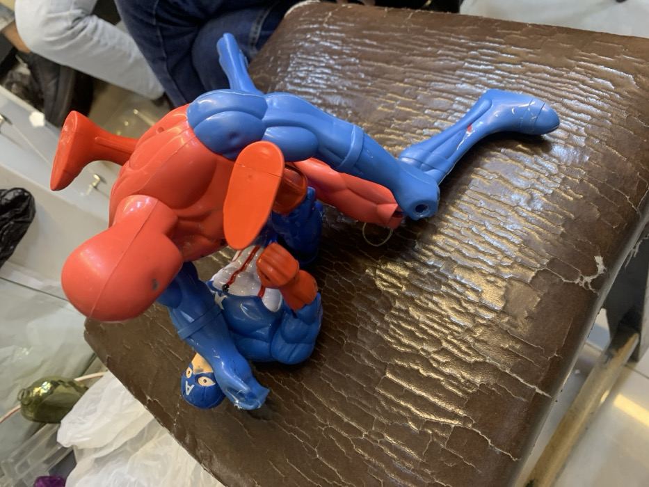 The image displays two plastic action figures situated on a brown, heavily distressed faux leather or vinyl upholstery surface, identified as being within the city of Barza Municipality, Syria. One action figure, predominantly red and blue plastic with a red head, consistent with a depiction of Spider-Man, is positioned atop a second figure. This figure exhibits prominent red footpads and a red dorsal attachment; its right blue leg is visibly detached at the hip joint. The second action figure, constructed of blue plastic with a white star and stripes on its chest and a blue helmet-like head bearing a white 'A,' consistent with a depiction of Captain America, is positioned supine beneath the red and blue figure, with its arms partially bent. The brown upholstery beneath the figures shows extensive cracking and peeling, revealing lighter material beneath. The background contains blurred elements including crumpled white plastic material, a dark green glass bottle with a protruding stick-like object, and the lower torsos and legs of two individuals; one in light-colored jeans and a white upper garment, and another in dark blue jeans, with a dark shoe also partially visible. The scene is illuminated by an interior light source.